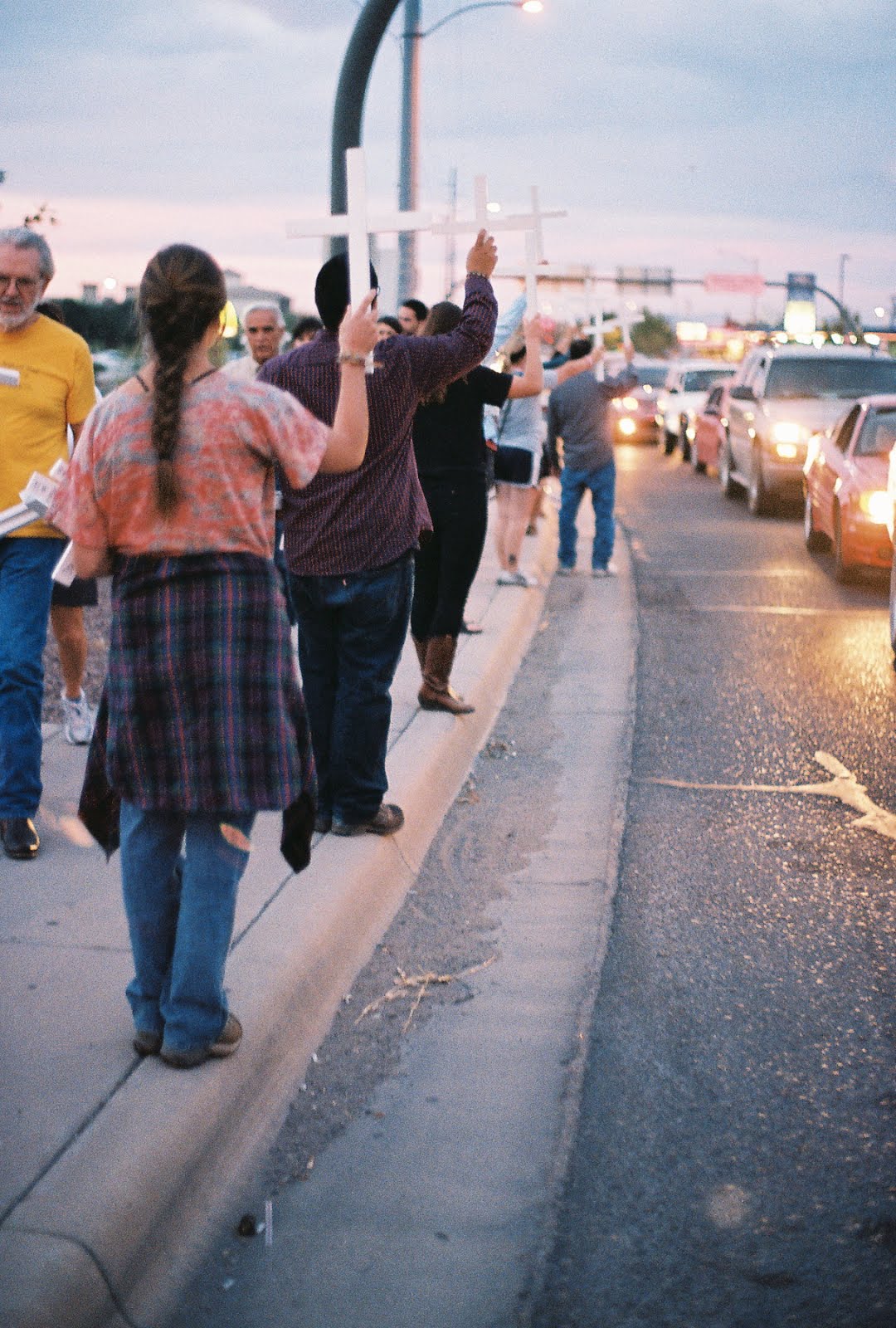 Our time in Agua Prieta/Douglas had a religious bent to it, and left a number of us thinking about how religion can span the border and motivate people to be allies in the name of brotherhood and sisterhood. While this left a few of us (including myself) feeling pretty conflicted, I found myself able to push past my discomfort to appreciate the weekly vigil that was held by Frontera De Cristo on the Douglas side of the border. Beginning in the parking lot of the local McDonalds, Mark distributed 100 some-odd crosses to participants of the vigil. Each cross was inscribed with the name, birth date, and death date or date of discovery of a migrant found in Cochise county, where Douglas is located. We set off south on Pan American Ave, arms full of crosses, walking single file towards the border and designated port of entry. Every few feet, the person at the head of the line would turn around, raise the cross bearing the name over their head, and say the name as loudly and respectfully as possible to the line of cars waiting to cross the border. After each name, everyone else in line shouted “presente!” After some time, each person would leave their cross in the street, leaning again the sidewalk, and return to the line. In this manner we leapfrogged all the way to the border, all the while inhaling the exhaust of those waiting to cross the border. Despite my discomfort with the repetition of crosses and the visual of people raising crosses over their heads, I recognized this form of remembrance as vital and healing. Shouting “PRESENTE!” into the night over and over again gave me an outlet for some of the frustration and anger that has grown inside me at how migrant deaths are repeatedly forgotten in American media and culture. Additionally, standing so close to the border while remembering those that had perished not too far away made it real to me that wherever I find myself in the borderlands, people are dying trying to reach this country and its economic opportunities. And while I may feel in the current recession that those economic opportunities are few and far between, I remind myself that largely because of my country’s actions, the economic opportunities in Mexico don’t hold a candle to those that I have daily access to in the US.